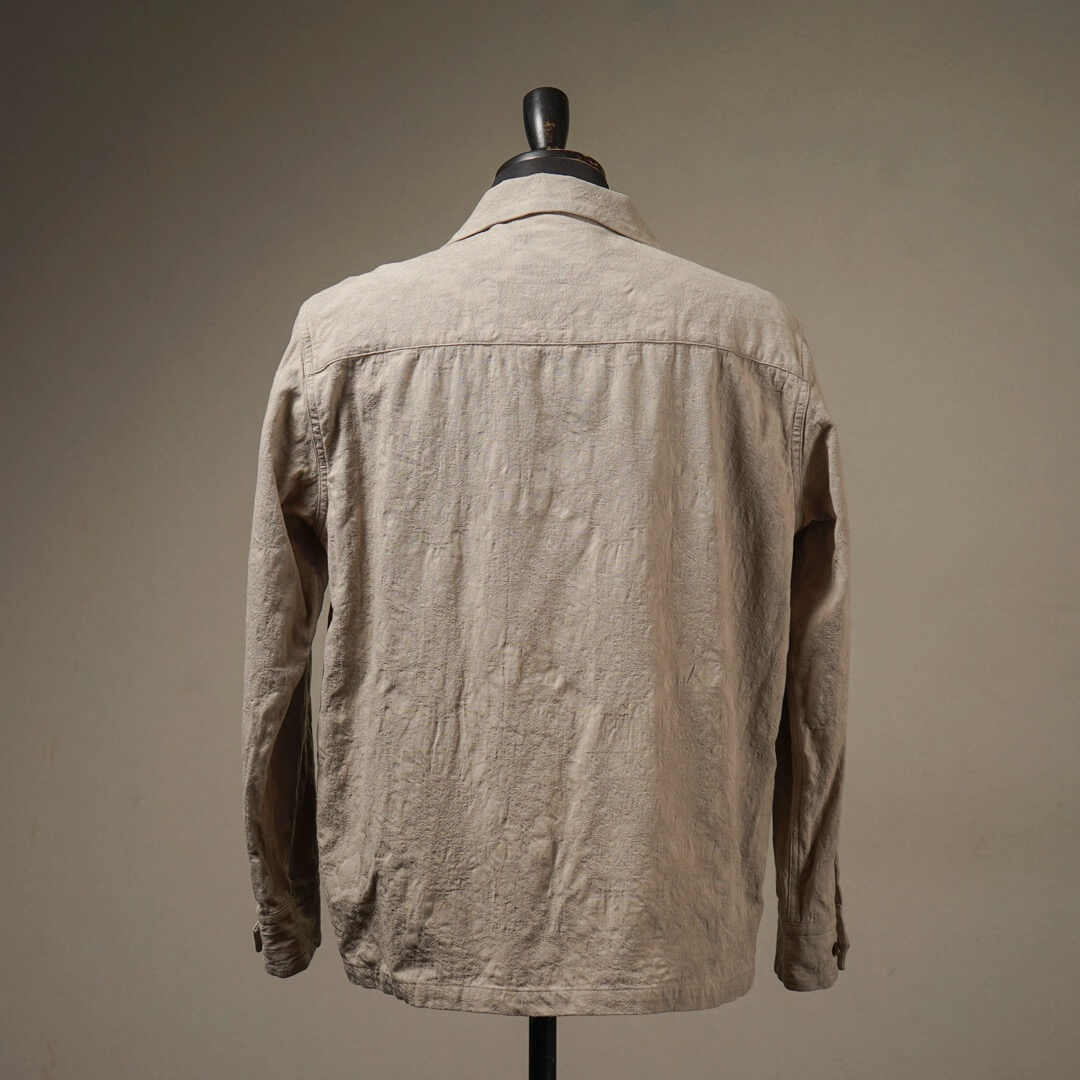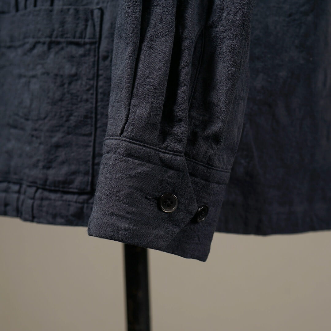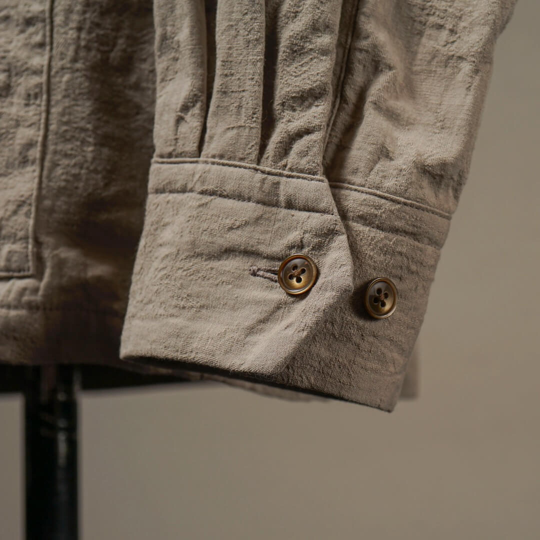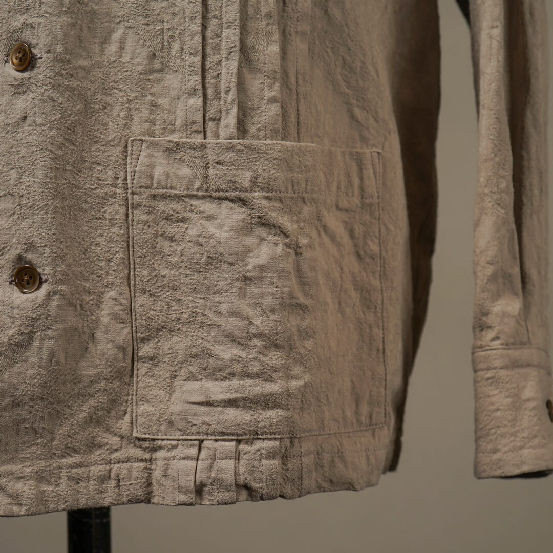 複数の組織で表現された柄部分を製品加工により際立たせつつ、膨らみを持たせヴィンテージライクな表情に仕上げました。