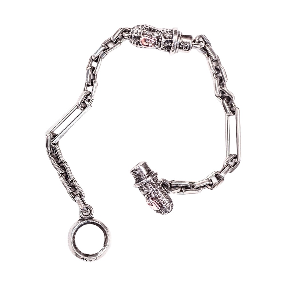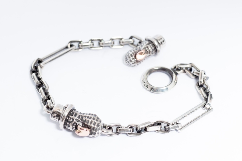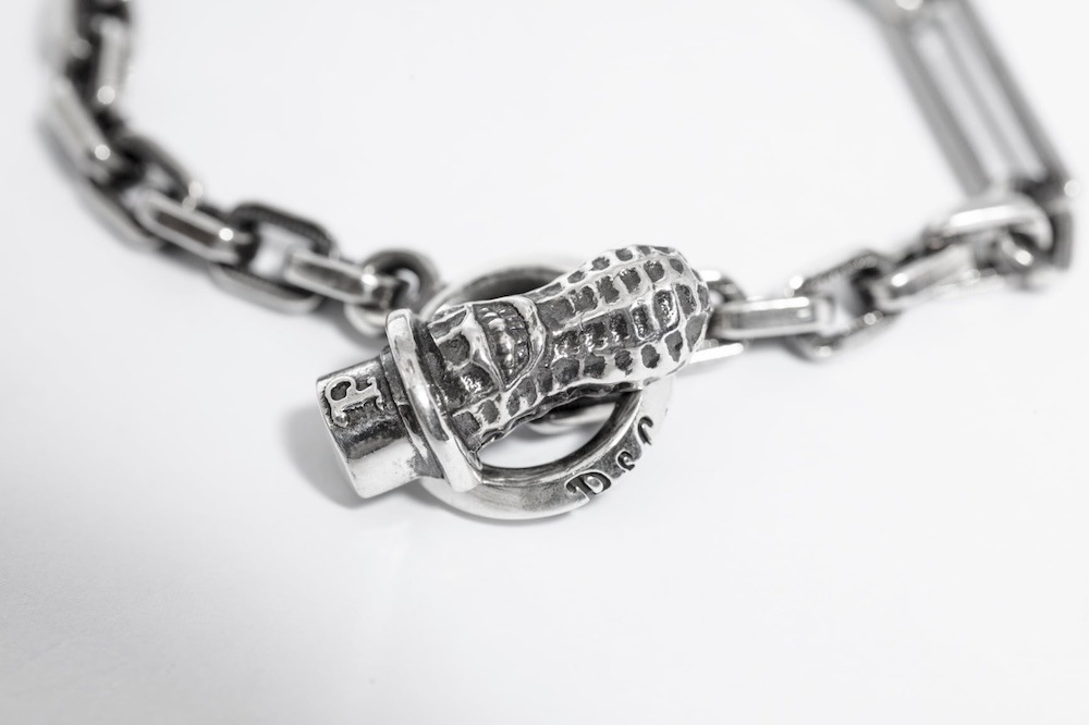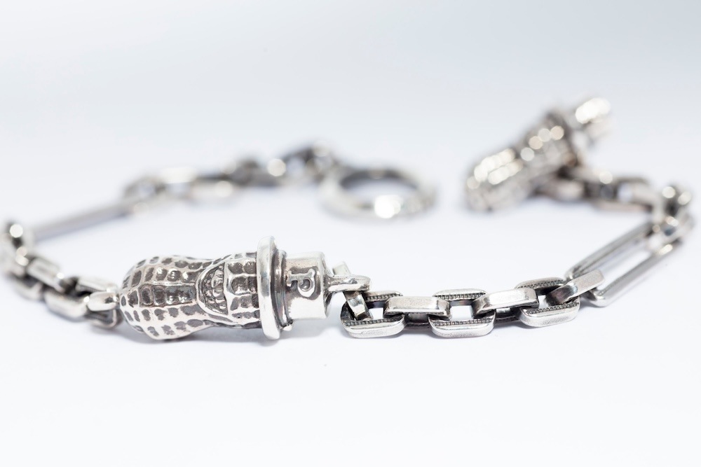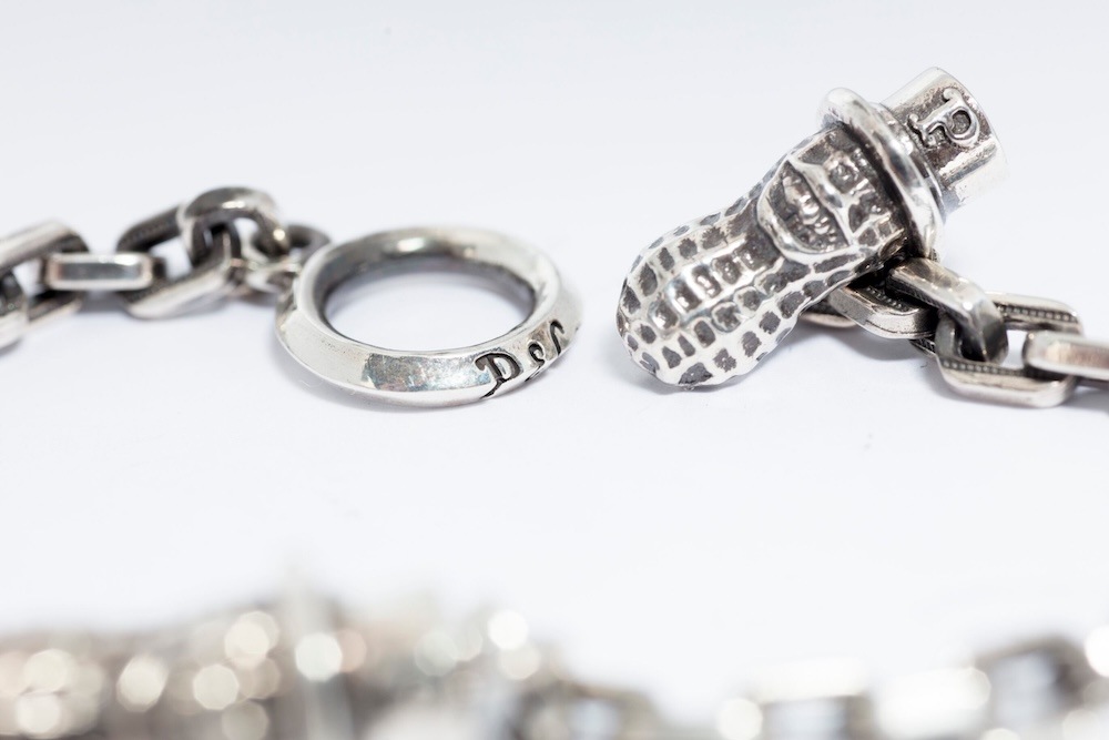 オリジナルの細めのチェーンブレスは細かいデザインがしてあり、留め具の部分はピーナッツが施されています。