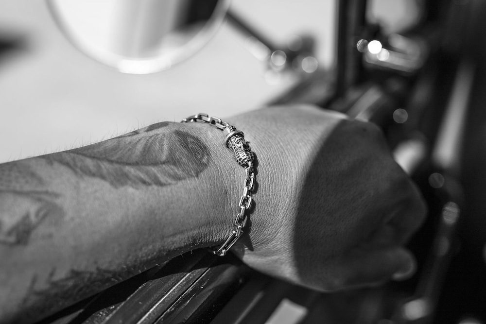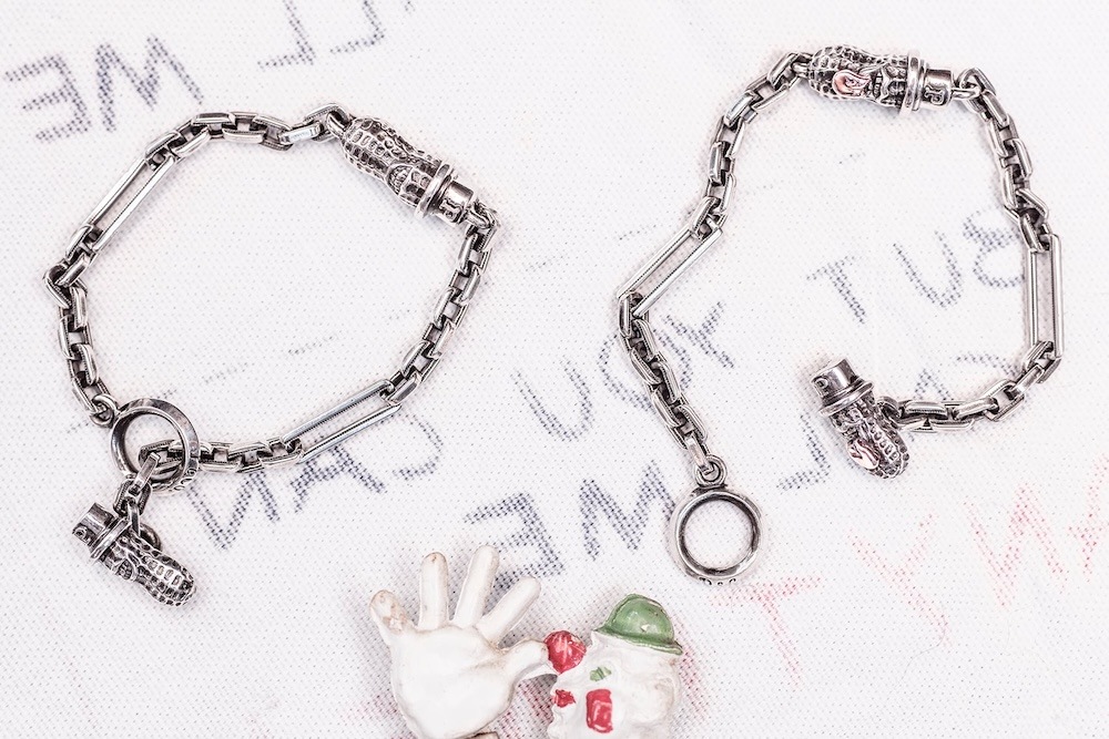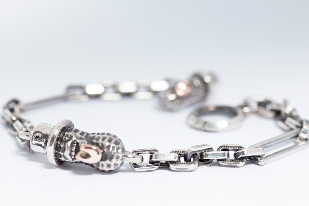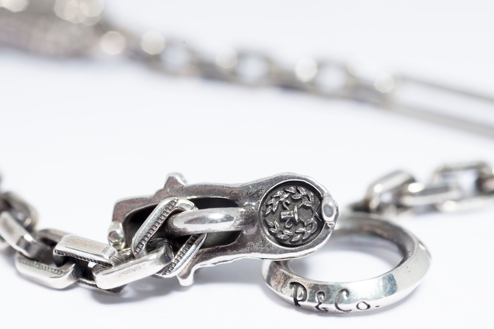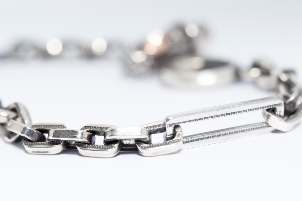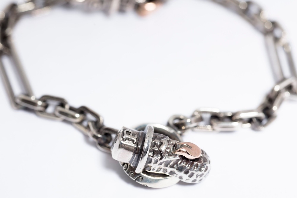 オリジナルの細めのチェーンブレスは細かいデザインがしてあり、留め具の部分はピーナッツが施されています。