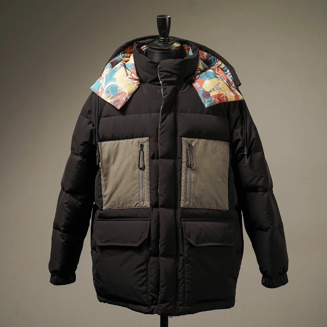 長めの着丈と、ややゆとりをもたせた身幅のリラックスサイズで、配色の胸ポケットと、前立部とフード裏から覗く総柄がアクセントとなっています。